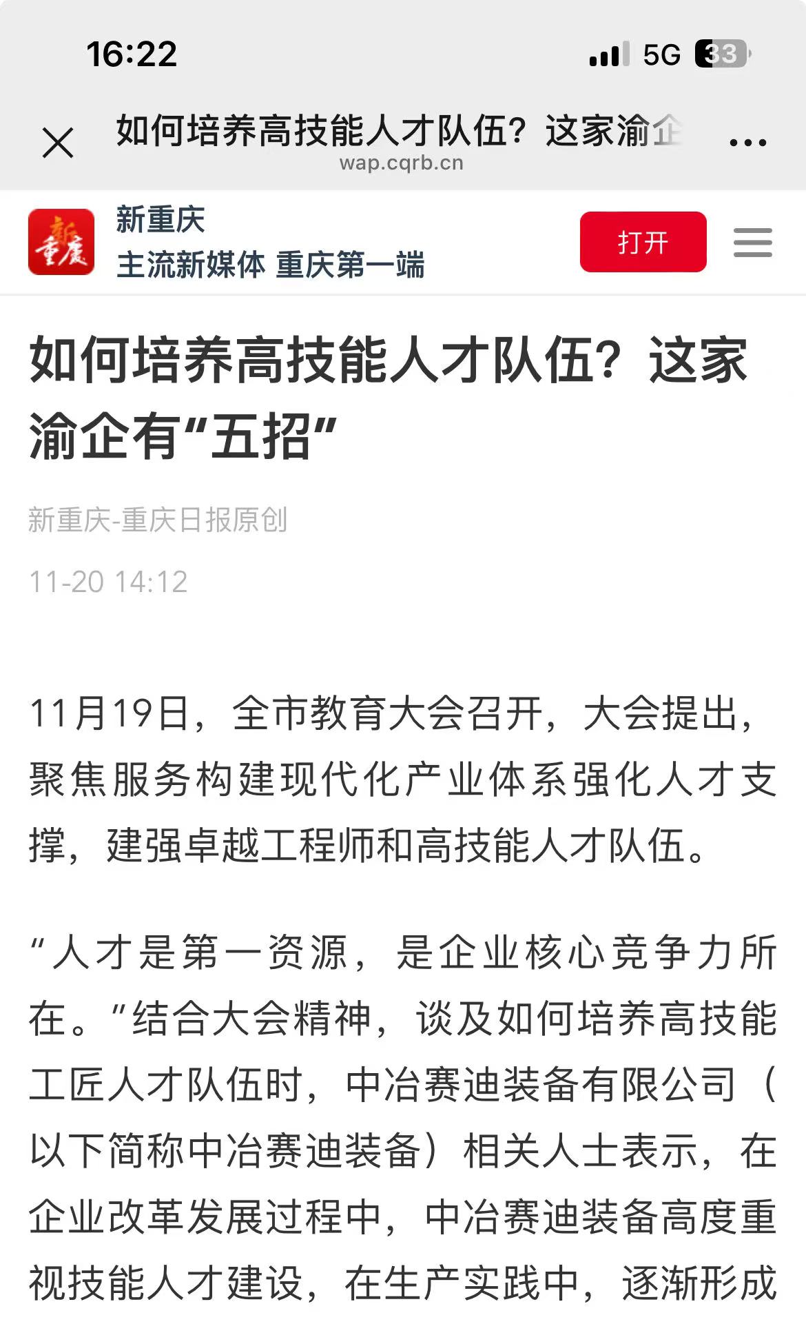 11月19日,全市教育大會召開,大會提出,聚焦服務(wù)構(gòu)建現(xiàn)代化產(chǎn)業(yè)體系強化人才支撐,建強卓越工程師和高技能人才隊伍。 11月20日,新重慶-重慶日報以“如何培養(yǎng)高技能人才隊伍?這家渝企有‘五招’”為題,報道中冶賽迪裝備在技能人才建設(shè)中的經(jīng)驗做法。